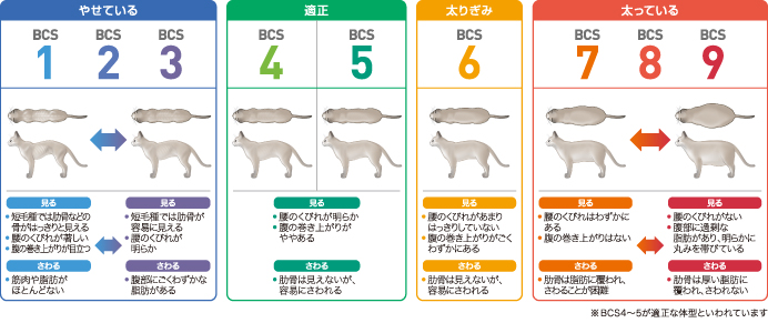 BCS(Body Condition Score)という体型の指標を元に、その子の体型を5段階または9段階に分類しています。