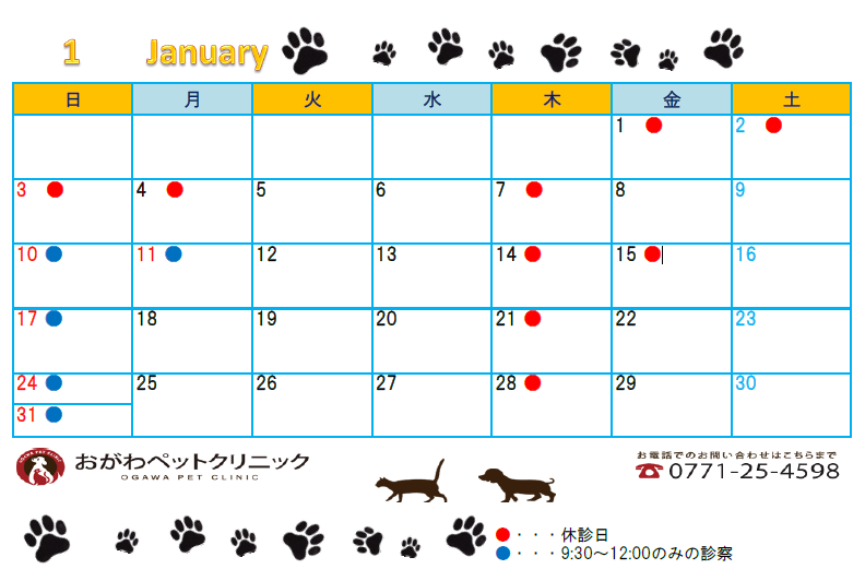 1月休診日は以下の通りです。